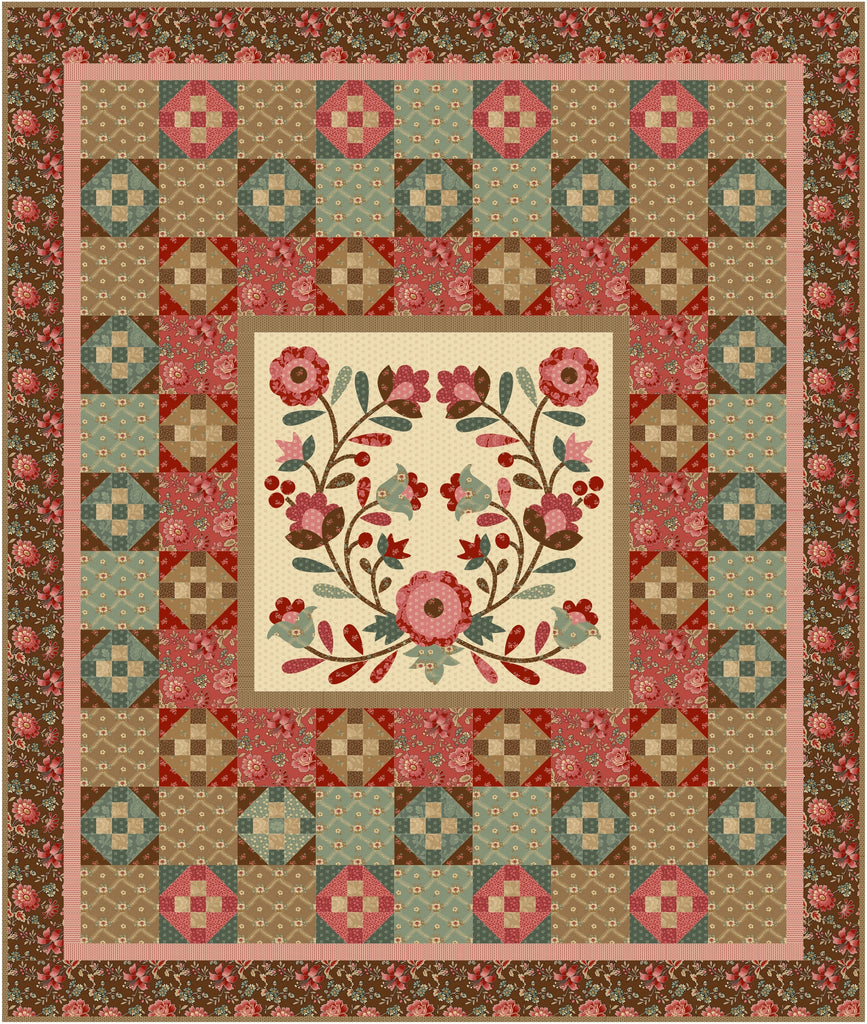Medallion style quilt with appliqué center block. Pattern includes full-size appliqué layout and paper templates. Printed Paper Pattern Finished Size: 75in x 75in