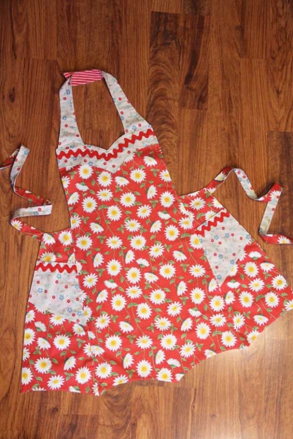 This popular apron features a sweetheart neckline and an umbrella hemline. Side panels each have a pocket. Neckband closes with hook and loop tape. Two 1 yd fabrics required and/or use coordinates for the neckline yokes. For a super bridal shower gift, make this apron and add a towel with a strip of apron fabric.