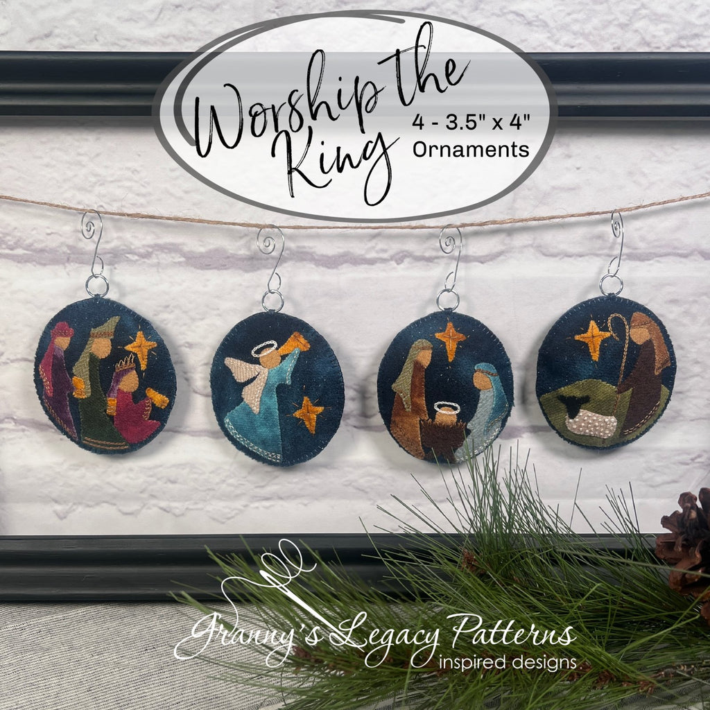 This beautiful set of 4 nativity ornaments is a perfect heirloom gift for someone special. Featuring stunning colors and simple embroidery, Worship the King is suitable for the experienced beginner, through the advanced stitcher. Techniques used: wool applique, perle cotton embroidery, and silk thread applique.