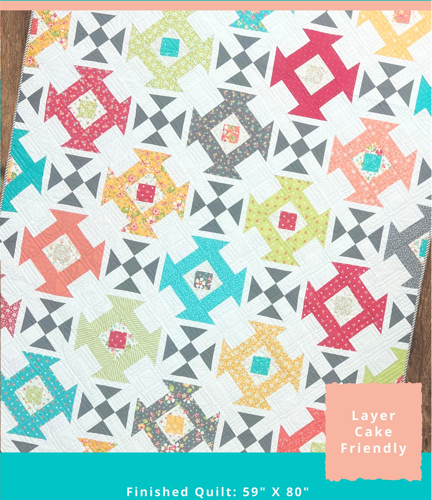 Tipsy Dash is a fun take on a traditional block with a modern twist. It's layer cake friendly and measures 59'X 80"