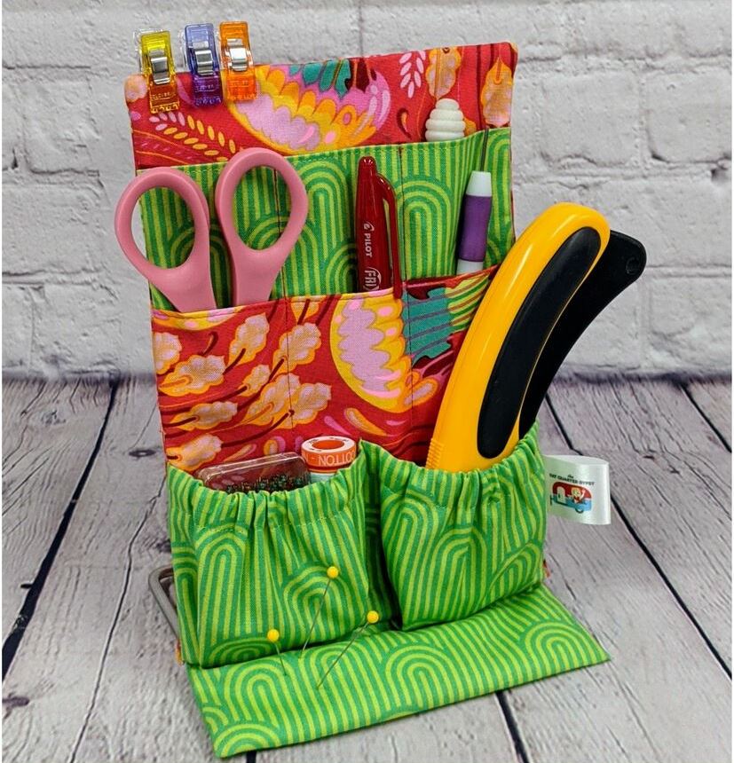 Sew Organized Mini! New compact design for tight spaces! Store your sewing and crafting essentials within easy reach. Four pockets and a pincushion slide onto a sturdy steel frame. Kit includes: Instructions, Frame, Elastic and Label. Uses 1 fat quarter or 2 fat eighths and stabilizer. Size: 4.5in x 5.5in x 2in. Goes together quickly!