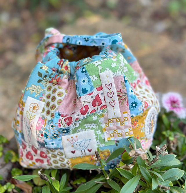A small drawstring dilly bag made using a Japanese boro-boro technique for the side panels, decorated with tiny stitcheries and embellishing stitches. *Pattern includes pre-printed stitchery fabric Printed Paper Pattern Finished Size: 5in x 5in x 5in