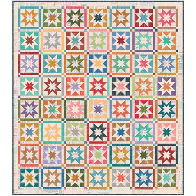 Easy to sew center star, surrounded by blocks in a variety of colors in two sizes: 72 x 84 (shown) and 85 x 97" (quilt shown with added borders)No special tools required.Pattern is full color and includes instructions for cutting, sewing, and assembly.