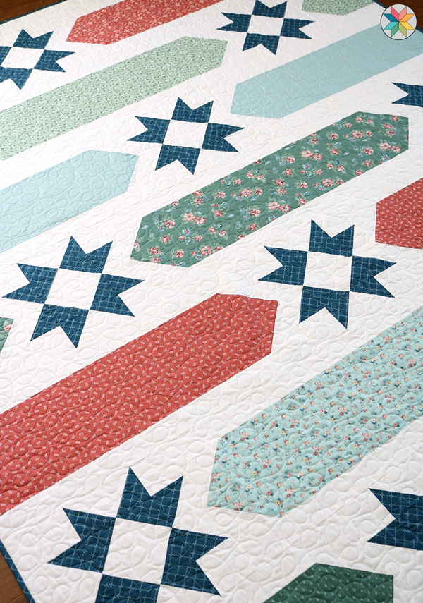 The Prim Village Quilt by Lori Holt of Bee in my Bonnet uses a 5" and 10" stacker and features pieced houses and churn dash blocks. Finished size is 57" x 68".