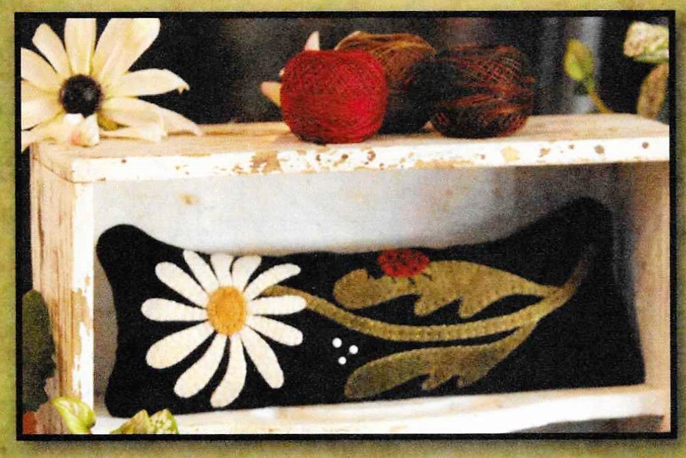 Originally from the Summer Gatherings book, is the beautiful daisy pincushion. Finished size is 3 1/2"x 9".