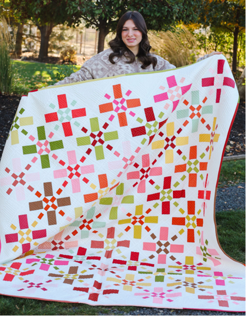 Positive Vibes is a fat quarter-friendly pattern.  Instructions include 2 size options: baby - 43" x 43" and throw - 71 1/4" x 85 1/2". Fat quarters include a scrappy binding.