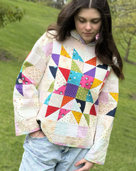 The Laura Jacket: a striking ladies' patchwork jacket pattern crafted with your unique style in mind. Make a statement with this quilted jacket using your favorite fabric collection or that cherished scrap stash. Do you have a quilt lying around that is rarely used? This pattern also gives instructions to whip up the jacket quickly with a beautiful pre-made quilt....