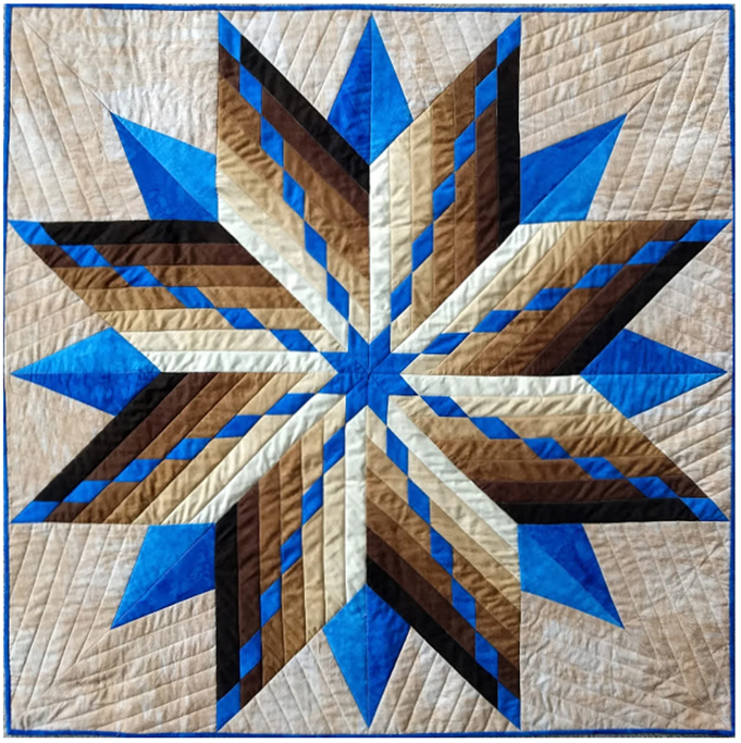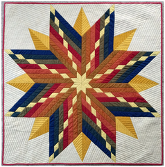 The technique used in piecing this eight-pointed Diamond Chain Star is strip piecing. Seven shades of brown are used for the diamonds, two shades of blue for the diamond chain and star points, and cream for the background. There are no inset seams and is a great project for one who wants to learn how to piece an 8-pointed star.Pieced...