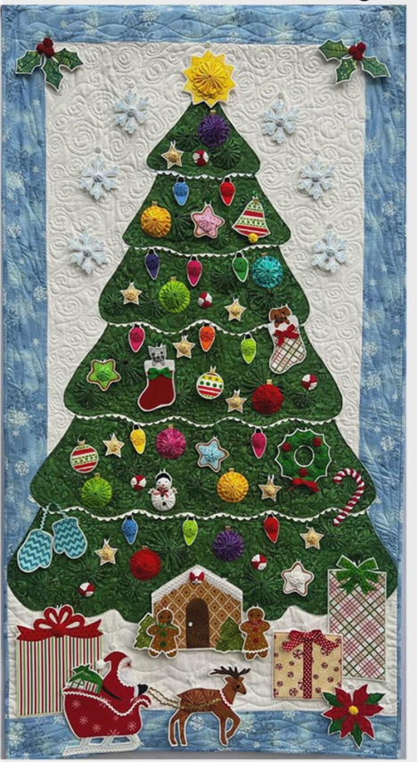 This whimsical door-sized Christmas tree quilt is created with fusible machine applique. Fabric yo-yos add fun and texture to the tree and many colorful and detachable ornaments. Ornaments are attached with ribbon loops and buttons and include snowflakes, stars, a gingerbread house with people, Santa in a sleigh with reindeer, a snowman, a wreath, cat and dog stockings and more. Finished size is 30 1/2" x 57".