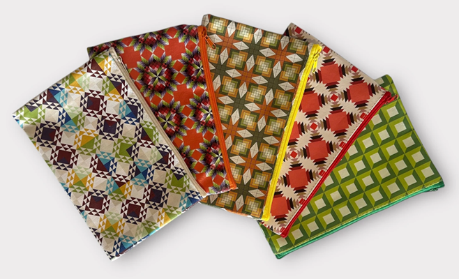 This set of pencil pouches includes five dazzling pencil pouches, each featuring a different color palette & quilt pattern. The pouches measure 8.27 in x 5.31 in, which makes them convenient for containing smaller items that you don’t want flying about. These really help when you’re on the go. 100% cotton with zipper closures. The following classic quilt patterns are featured: Carpenter's Wheel, Cut Glass, Flight of Swallows, Lattice Square, and Pineapple Block.