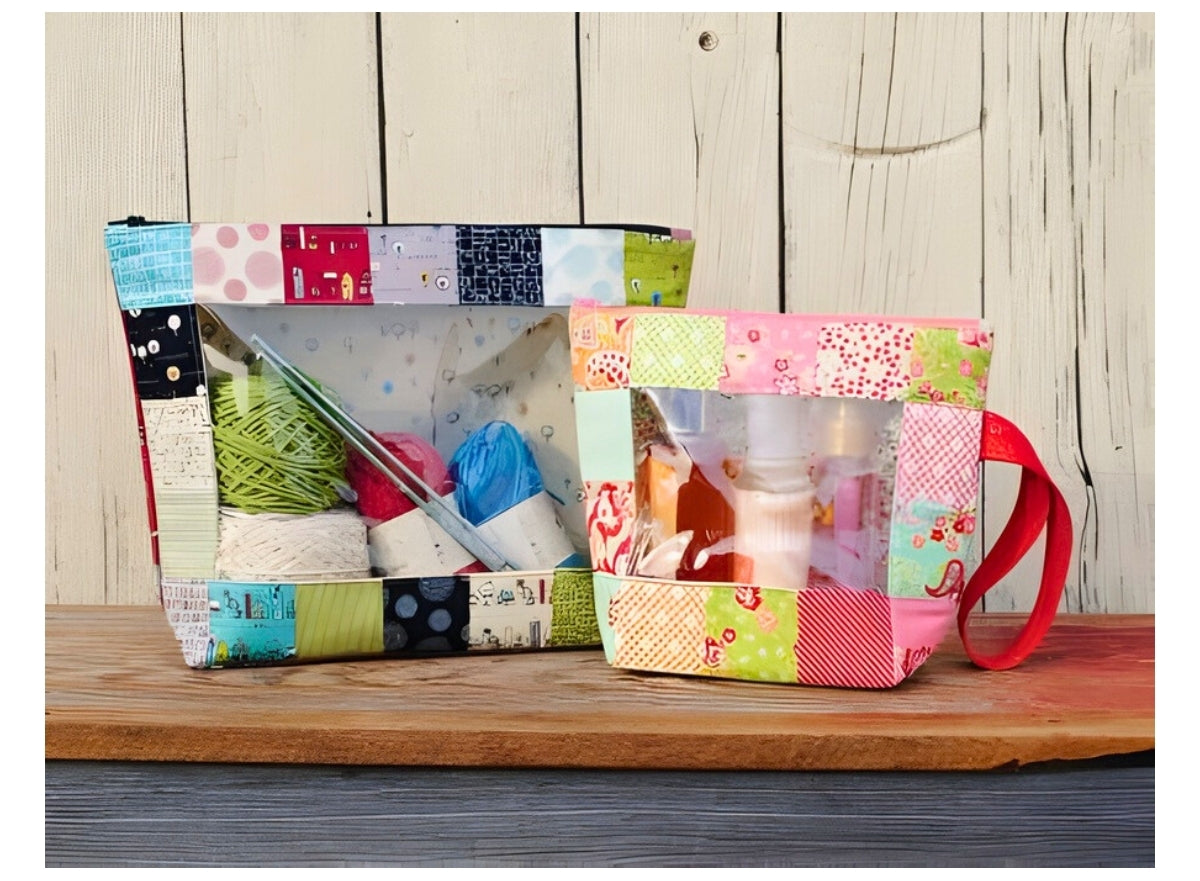Discover the perfect solution for organizing your crafting supplies with these charming pouches. The set includes a small pouch, measuring 8" x 10", and a large pouch, measuring 10" x 14", both featuring a delightful patchwork design with various colorful patterns like polka dots, stripes, and floral prints. Each pouch has a clear vinyl front, allowing you to easily see the contents, whether it's yarn, fabric, or other small items. The small pouch is ideal for holding smaller crafting essentials, while the larger one can accommodate more substantial projects. Both pouches come with a sturdy zipper closure and are finished with fusible interfacing for added durability. The vibrant red handle on the small pouch adds a playful touch, making it easy to carry around.