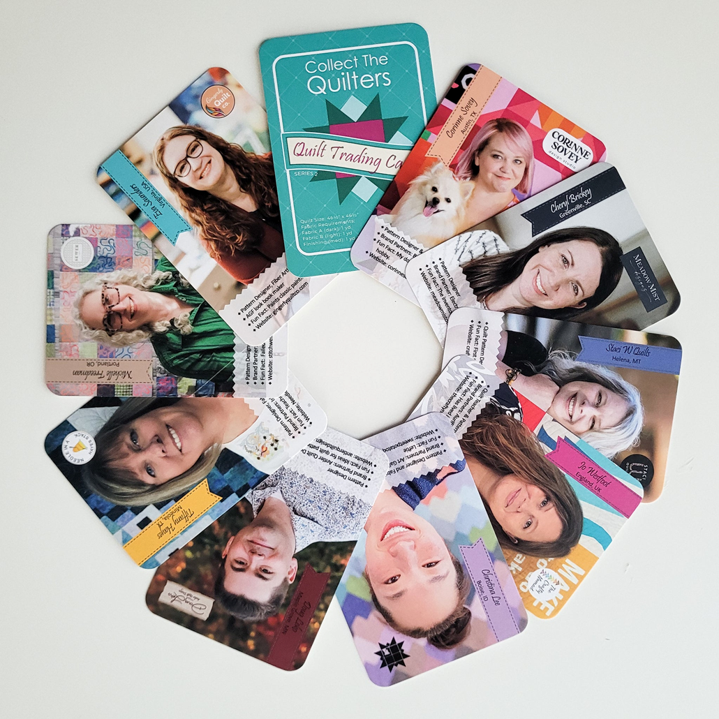 Collect these trading cards with your favorite quilt designers, and discover new favorites! This set includes 9 trading cards. The front of each card features a quilt designer. The back of each card has instructions for a 12" finished quilt block. Pack includes finishing instructions to make a baby quilt (finishes at 46 1/2" x 46 1/2") from the blocks.